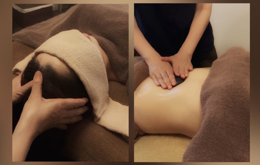 自律神経を整え、質の良い眠りを得ることを目的とした「31式腸脳相関セラピー」はホットストーンを使う腸セラピーと、頭蓋骨矯正を中心に頭全体を緩める手技による31式ヘッドセラピーを組み合わせ、腸と頭、両方からアプローチするセラピーです。
